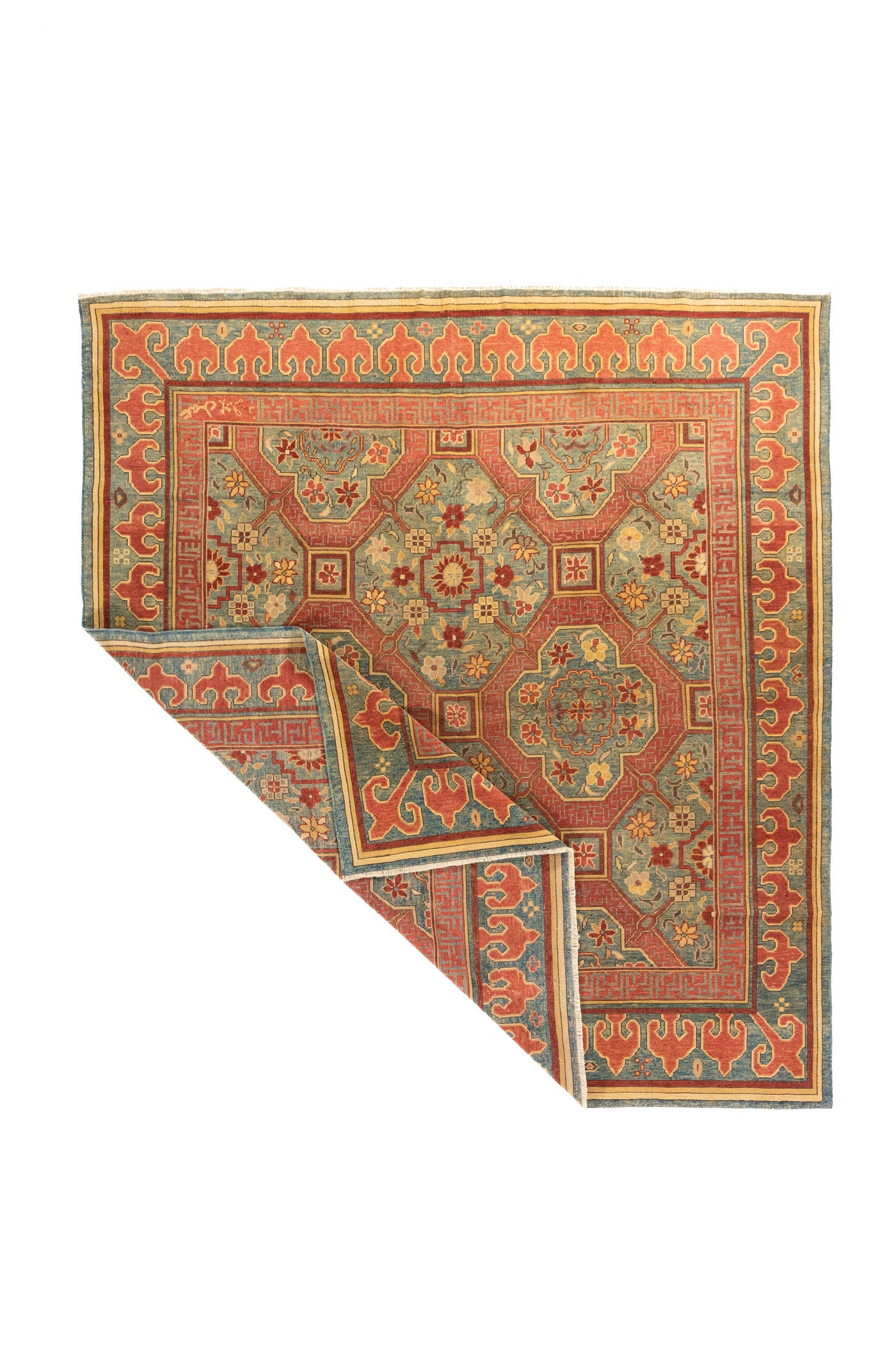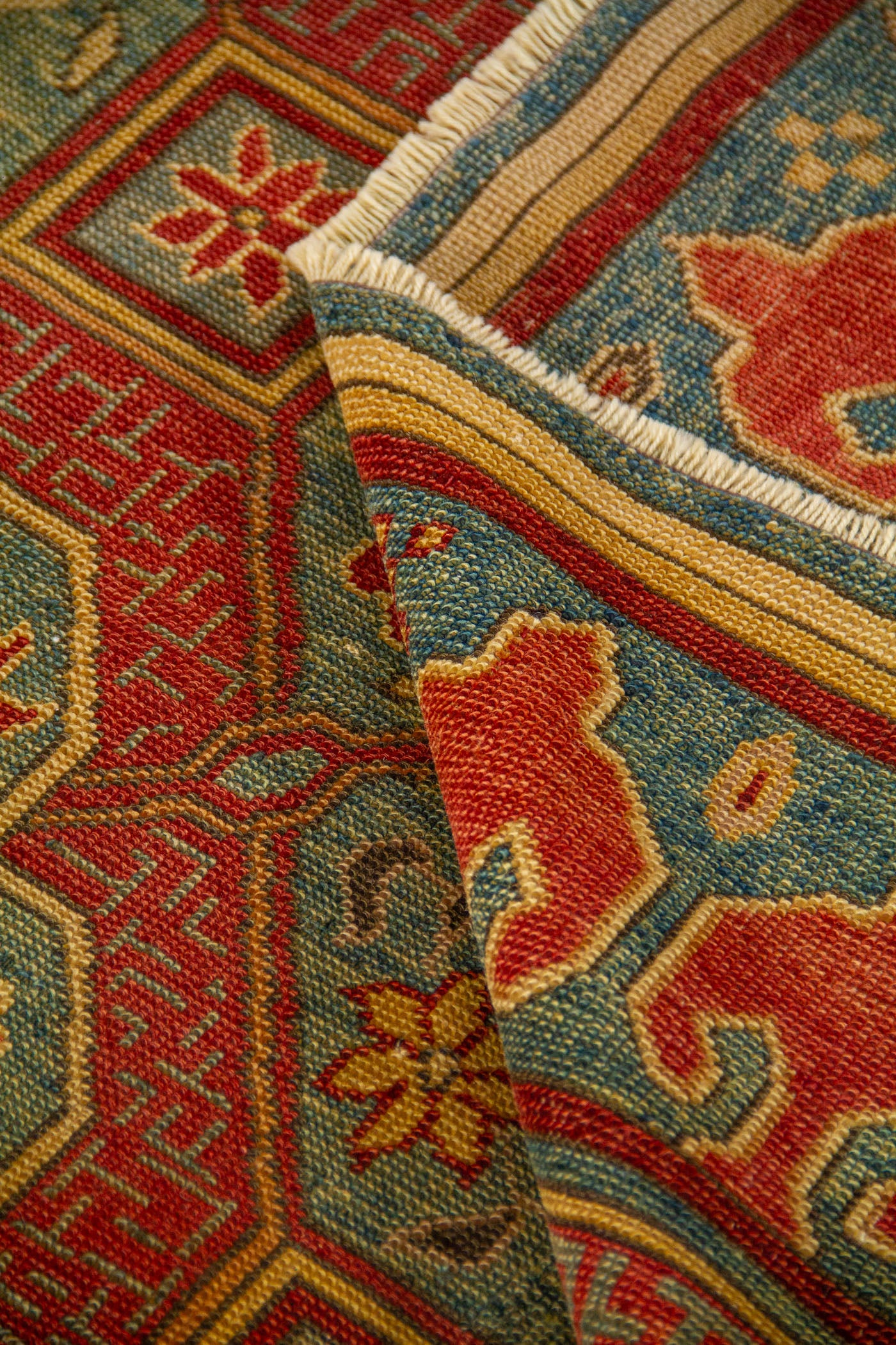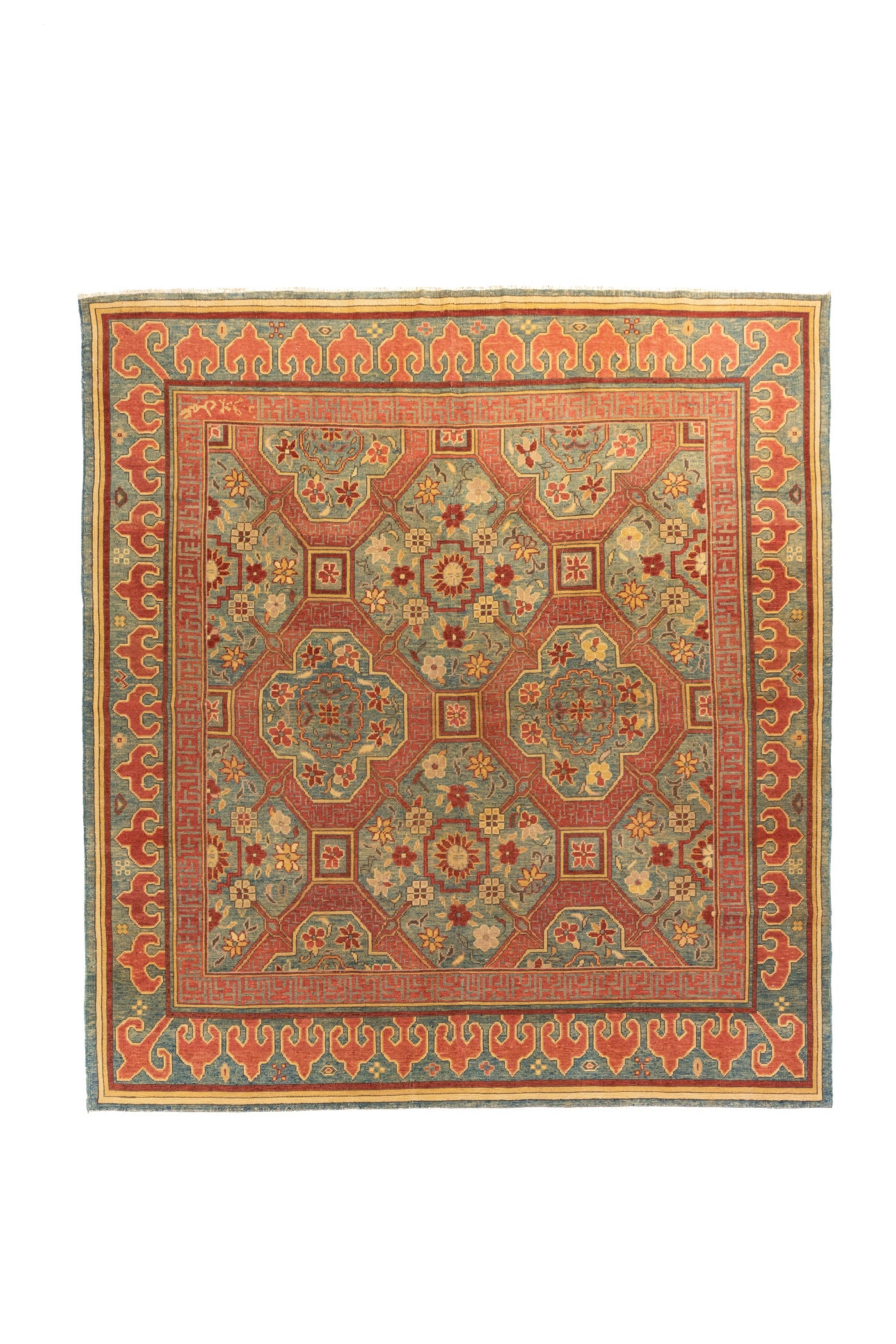 Diseño: Esta alfombra destaca por su elegante combinación de azul, verde, rojo y beige, una paleta que aporta equilibrio, calidez y una estética tradicional de gran carácter. Su composición geométrica se organiza a partir de marcos y figuras simétricas que estructuran el campo central con precisión, mientras pequeños motivos florales suavizan el conjunto y enriquecen visualmente cada sector del diseño. La guarda ancha en tonos rojo enmarca la pieza con fuerza decorativa y presencia, creando un contraste armonioso con el fondo azul y verde. El resultado es una alfombra sofisticada y atemporal, ideal para realzar cualquier espacio con un aire clásico, artesanal y lleno de personalidad.