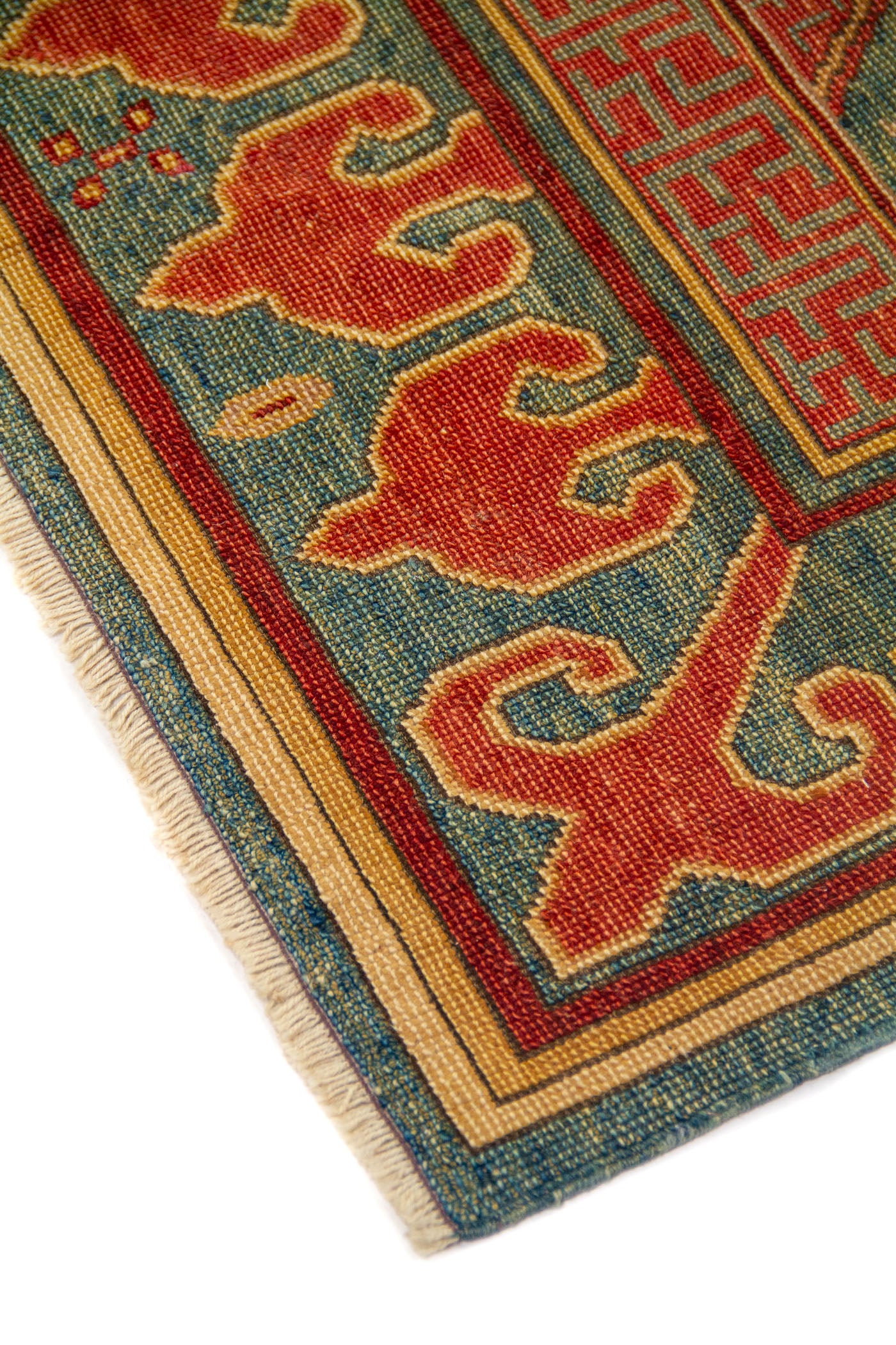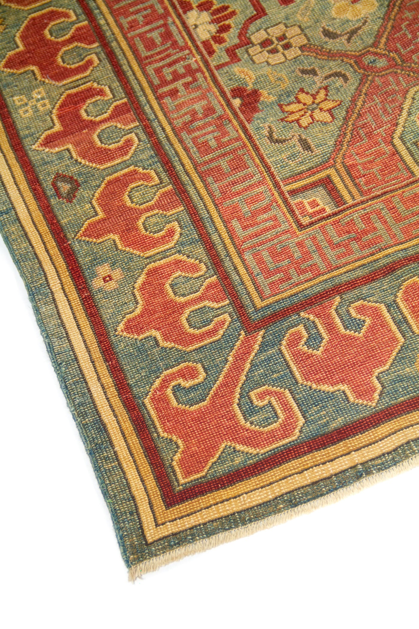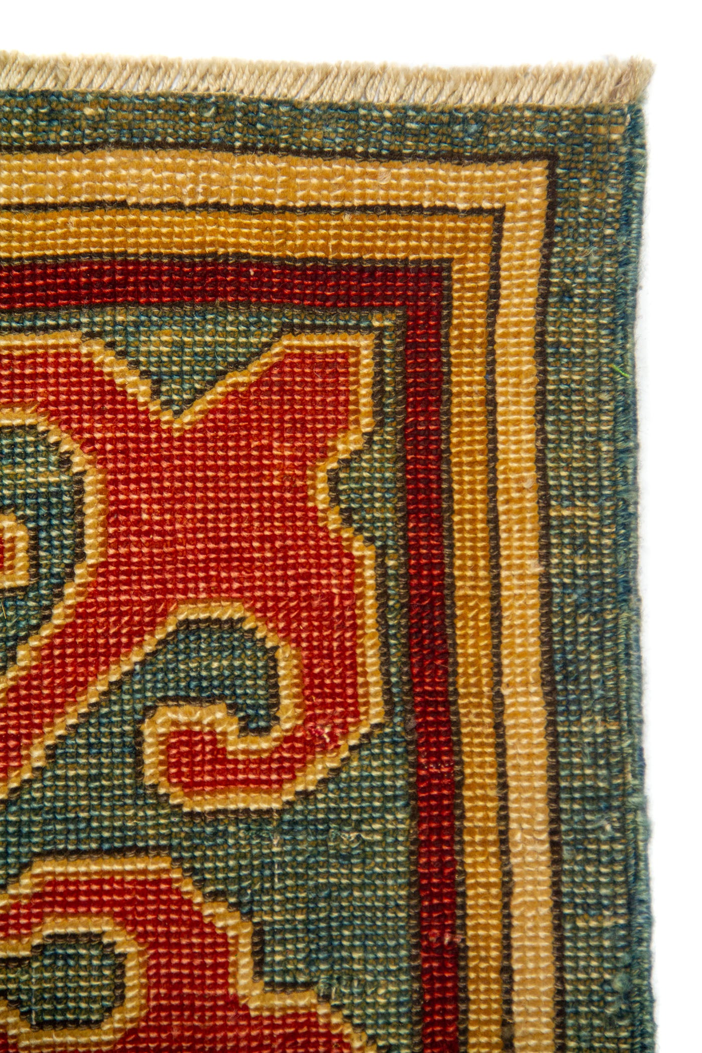 Diseño: Esta alfombra destaca por su elegante combinación de azul, verde, rojo y beige, una paleta que aporta equilibrio, calidez y una estética tradicional de gran carácter. Su composición geométrica se organiza a partir de marcos y figuras simétricas que estructuran el campo central con precisión, mientras pequeños motivos florales suavizan el conjunto y enriquecen visualmente cada sector del diseño. La guarda ancha en tonos rojo enmarca la pieza con fuerza decorativa y presencia, creando un contraste armonioso con el fondo azul y verde. El resultado es una alfombra sofisticada y atemporal, ideal para realzar cualquier espacio con un aire clásico, artesanal y lleno de personalidad.