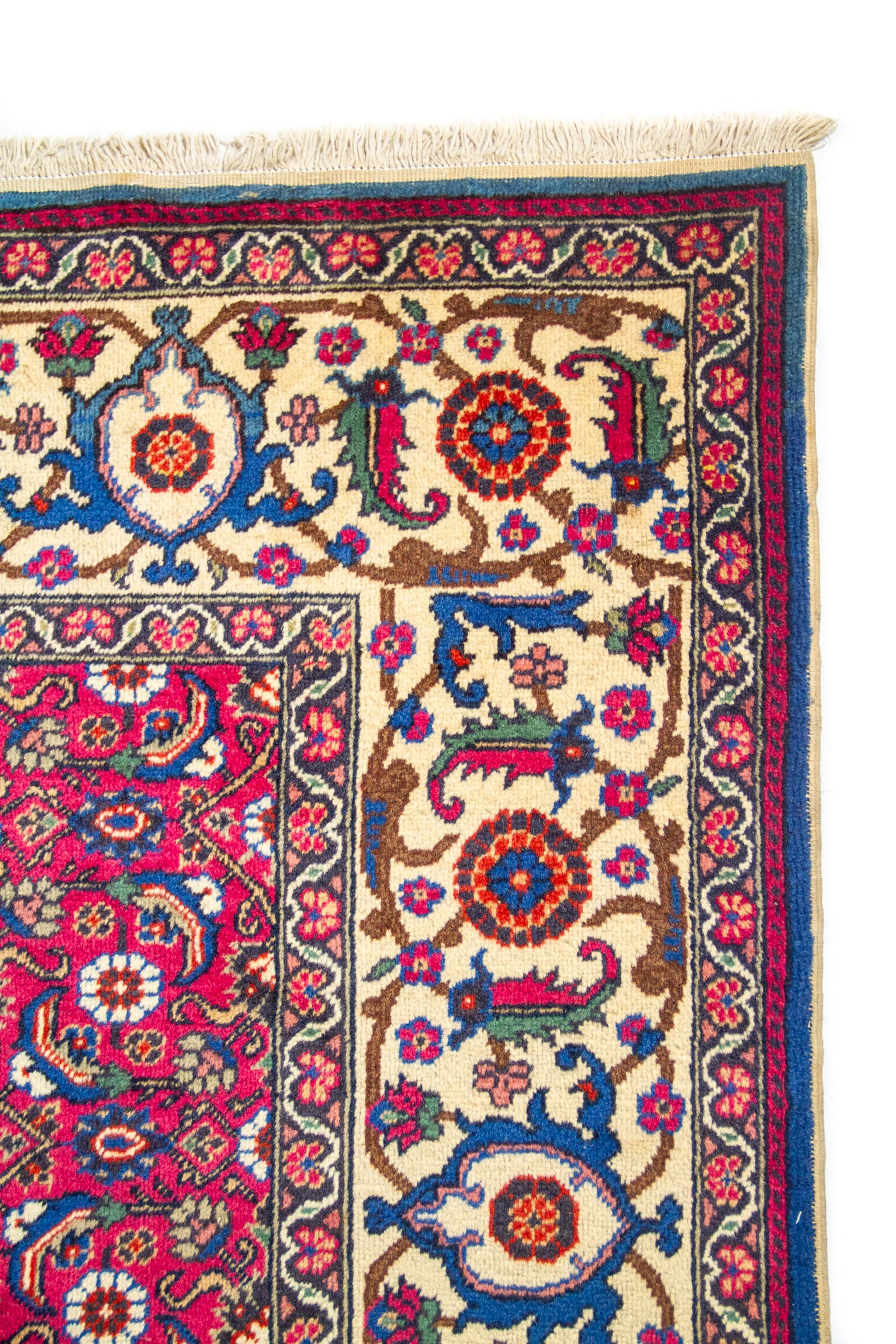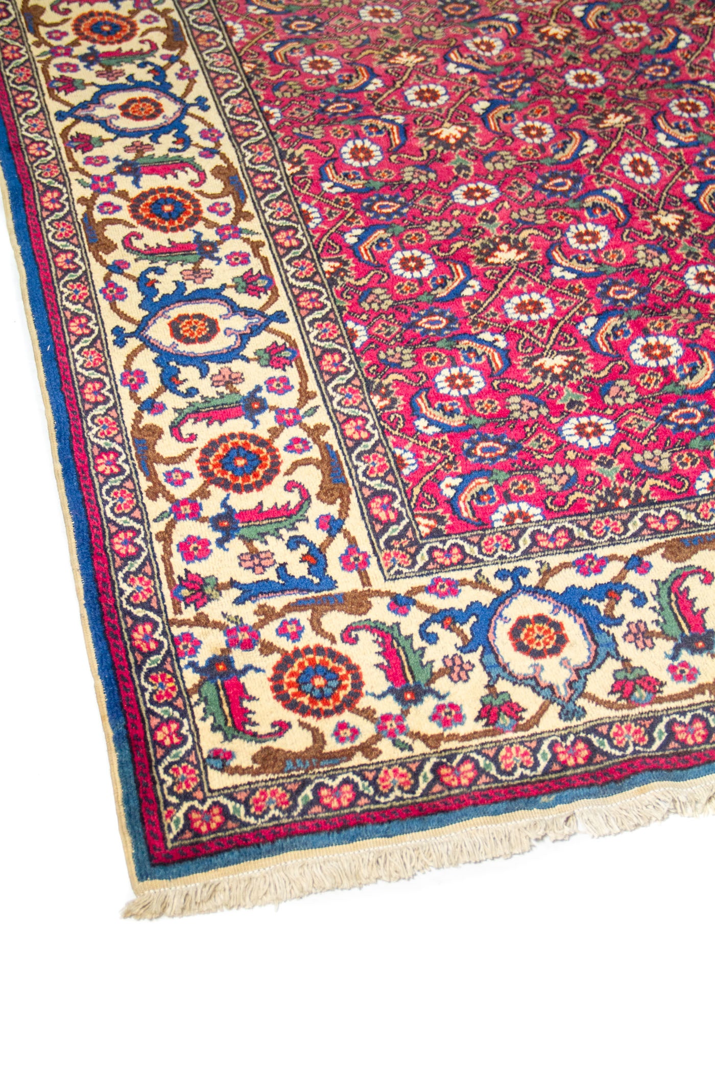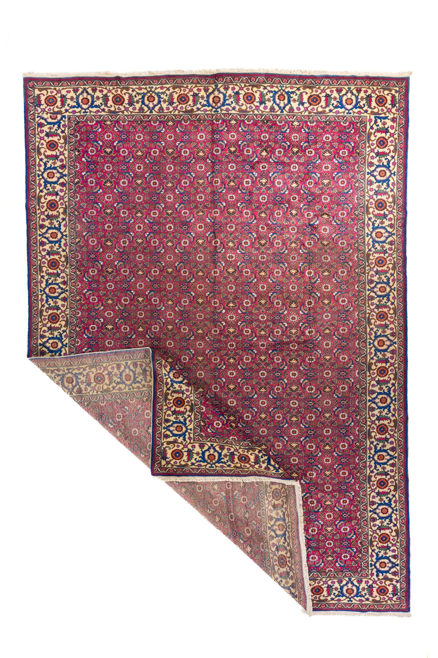 Diseño: Esta alfombra destaca por su intenso fondo rojo, que aporta calidez, energía y una presencia visual muy marcada en el espacio. Su superficie está cubierta por un elaborado patrón repetitivo de inspiración floral y geométrica, creando una composición rica en detalle, equilibrio y profundidad ornamental. La guarda beige enmarca la pieza con elegancia y genera un contraste refinado que realza los acentos en azul, verde y rojo distribuidos a lo largo del diseño. El resultado es una alfombra de fuerte carácter decorativo, ideal para sumar sofisticación, tradición y un toque clásico atemporal a cualquier ambiente.