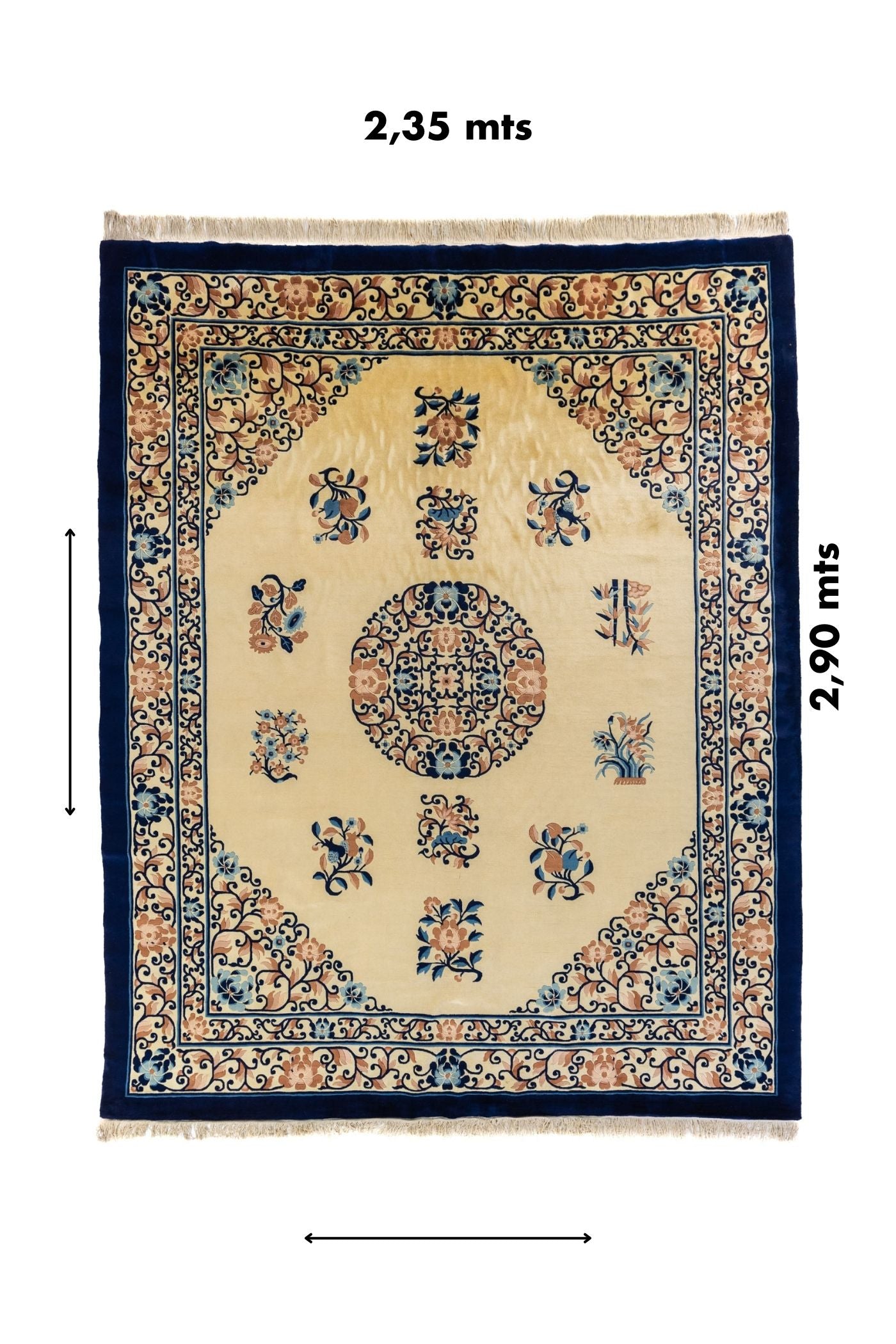 Diseño: Esta alfombra combina un elegante fondo beige con una imponente guarda azul marino que enmarca la pieza como un marco decorativo. El centro presenta un medallón circular de inspiración floral, rodeado por ramilletes y motivos delicados distribuidos de forma equilibrada, creando una sensación de orden y armonía visual.