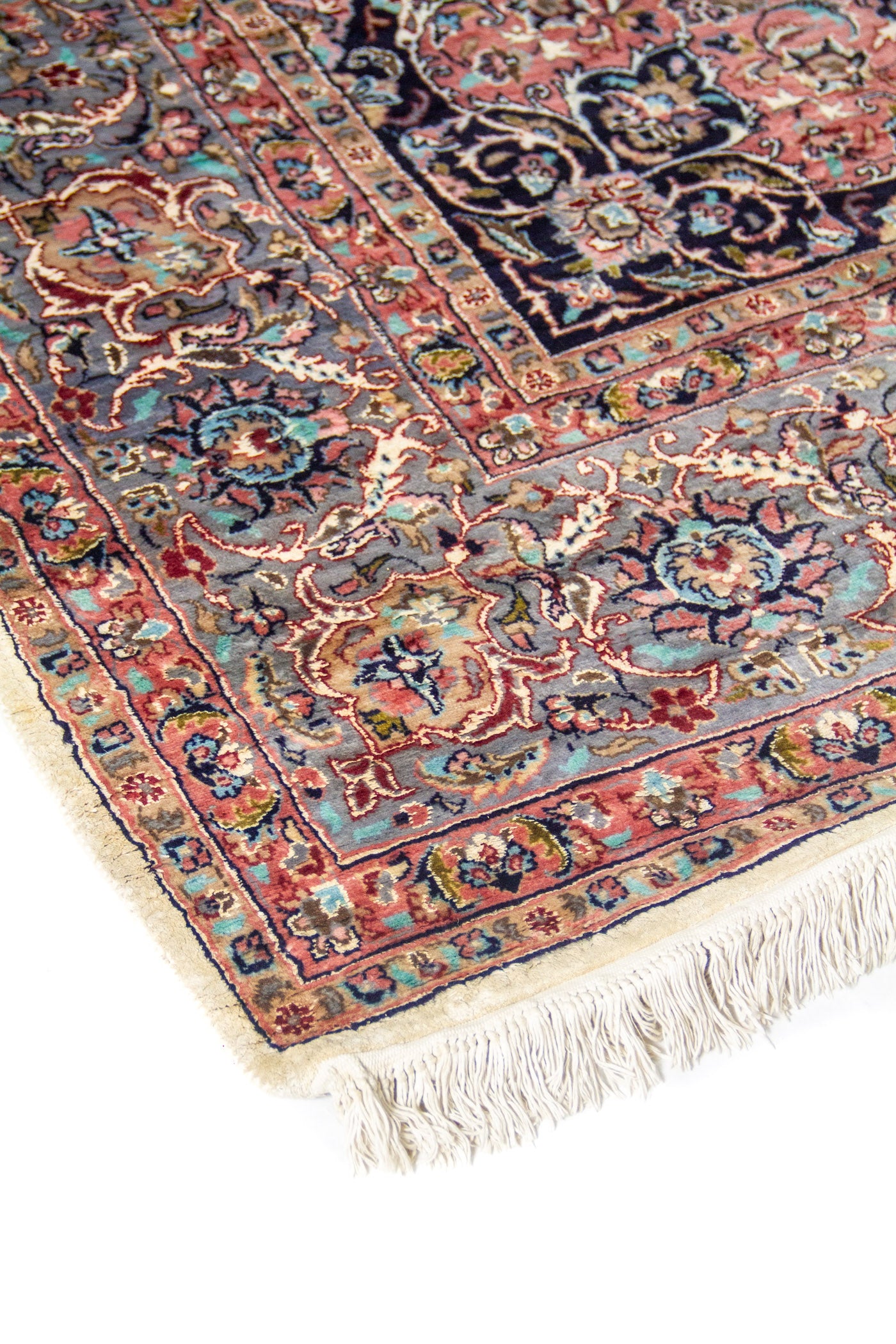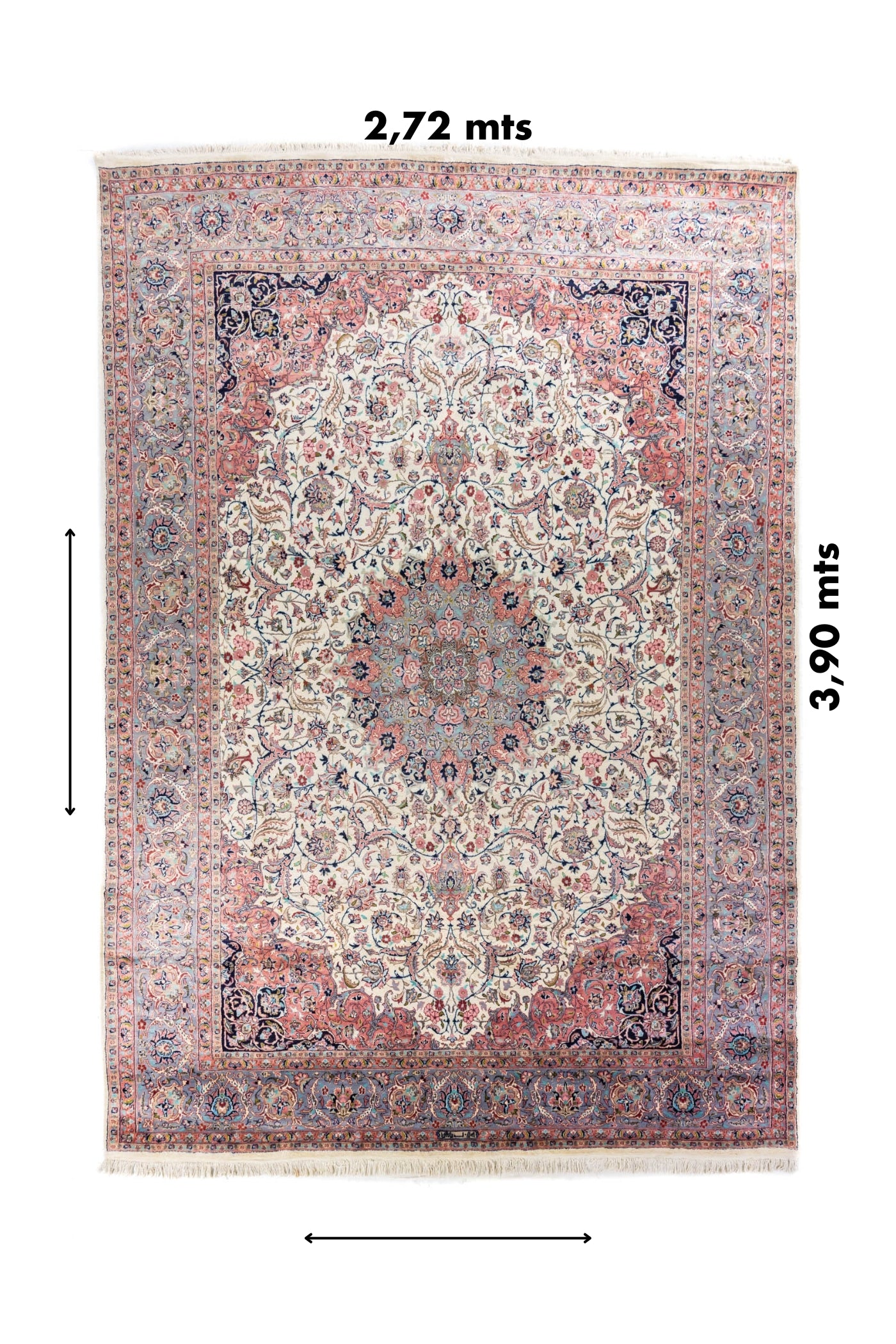 La amplia guarda ornamental enmarca el diseño con gran riqueza decorativa, incorporando motivos florales y detalles minuciosamente elaborados que evocan la tradición textil de Oriente. La simetría del patrón y la precisión de cada trazo reflejan una meticulosa destreza artesanal, visible también en la calidad del tejido y en los flecos cuidadosamente terminados.