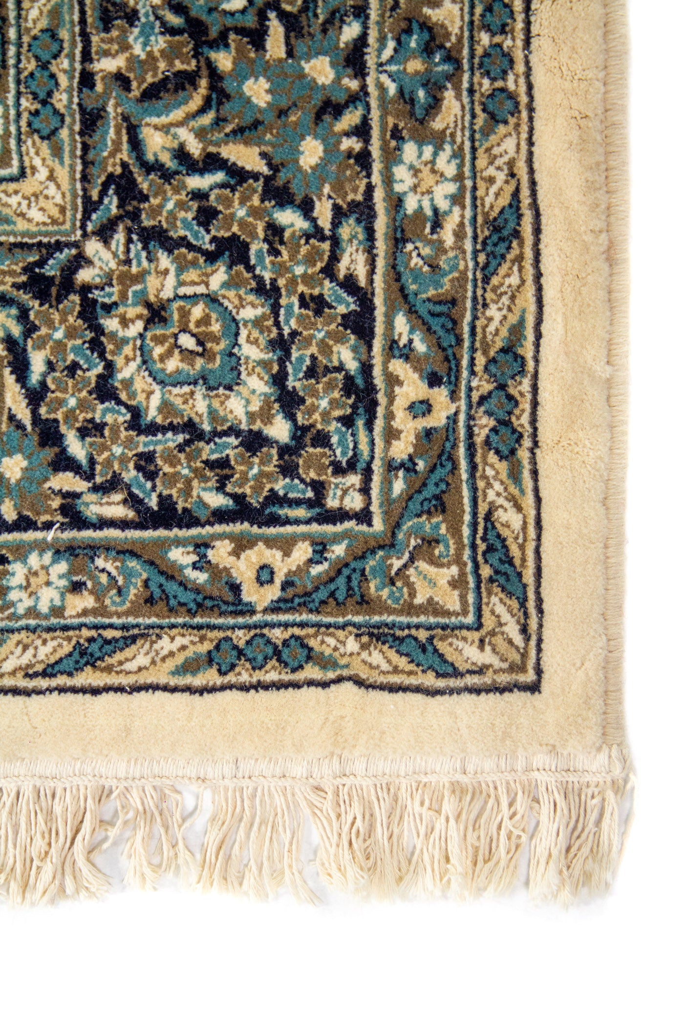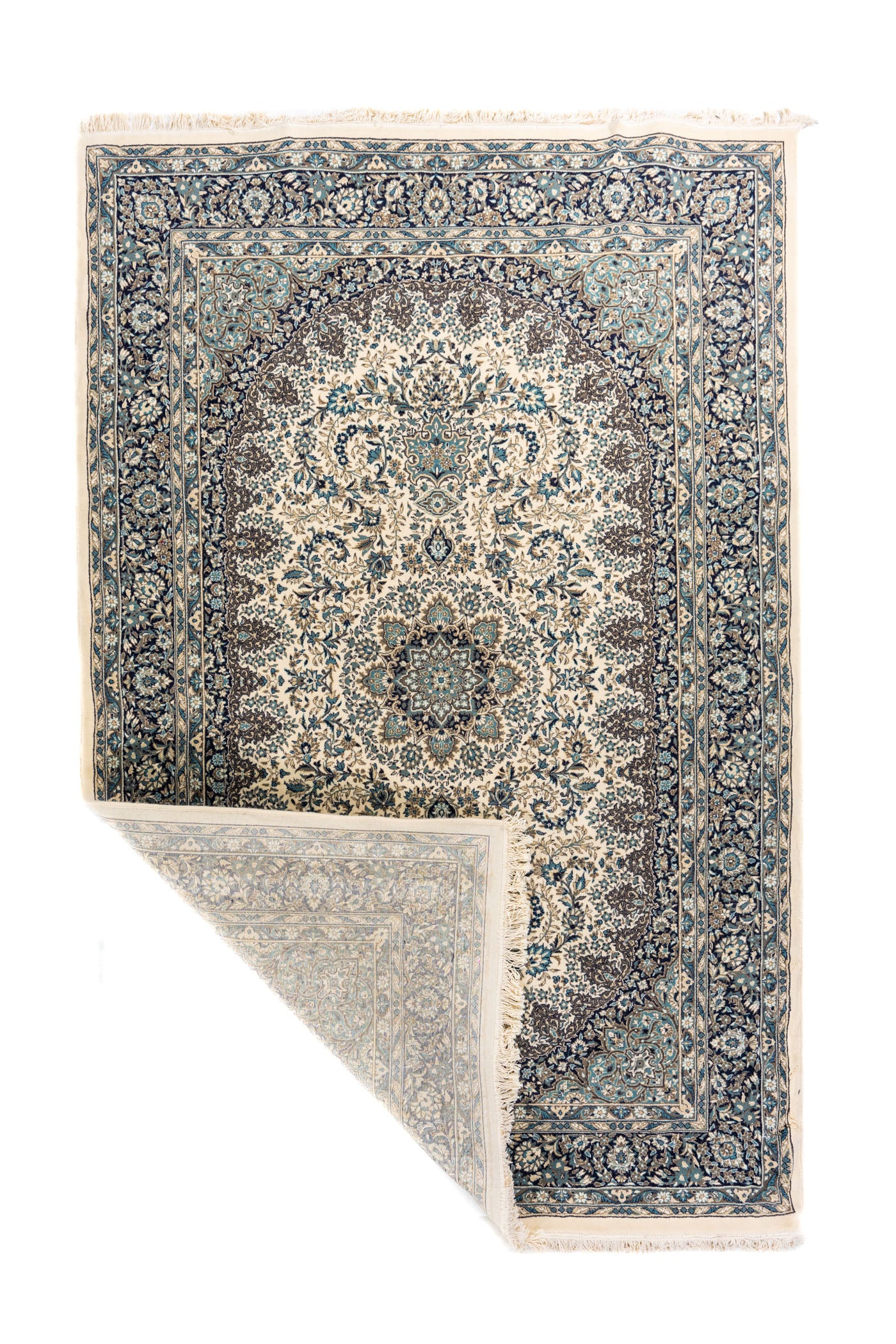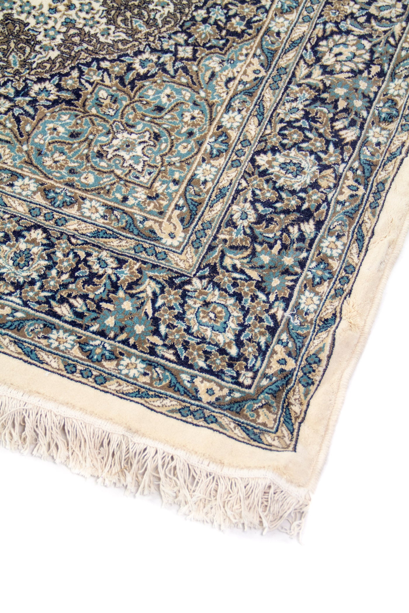 Diseño: Esta alfombra destaca por su elegancia clásica y su refinada composición ornamental. El fondo blanco suave aporta luminosidad y amplitud visual, mientras que el medallón central en tonos azul, celeste y gris crea un punto focal sofisticado y armonioso. Su guarda floral ancha, rica en detalles y contrastes, enmarca la pieza con gran delicadeza y resalta la inspiración tradicional de estilo persa. Los motivos vegetales distribuidos de manera simétrica le dan movimiento, profundidad y un aire distinguido, ideal para realzar ambientes con una presencia serena y atemporal. Los flecos en los extremos y la fineza del dibujo completan una pieza de gran belleza decorativa y apariencia artesanal.