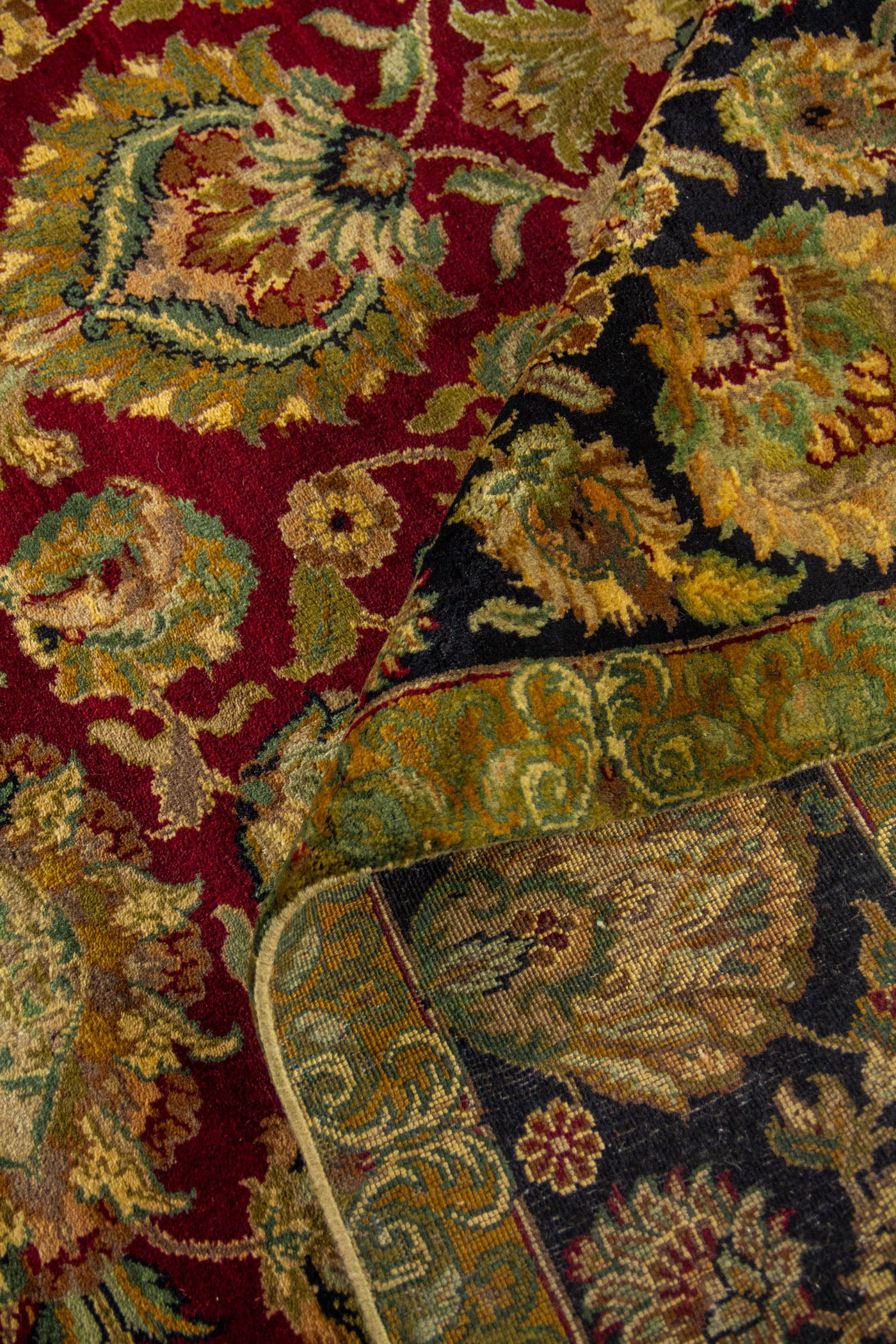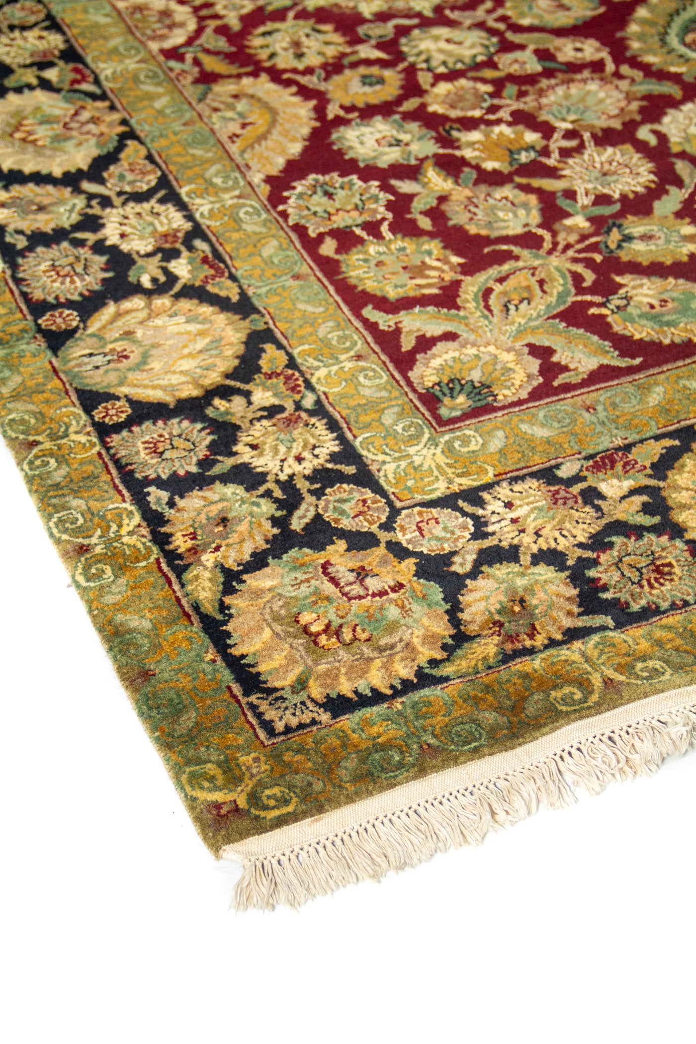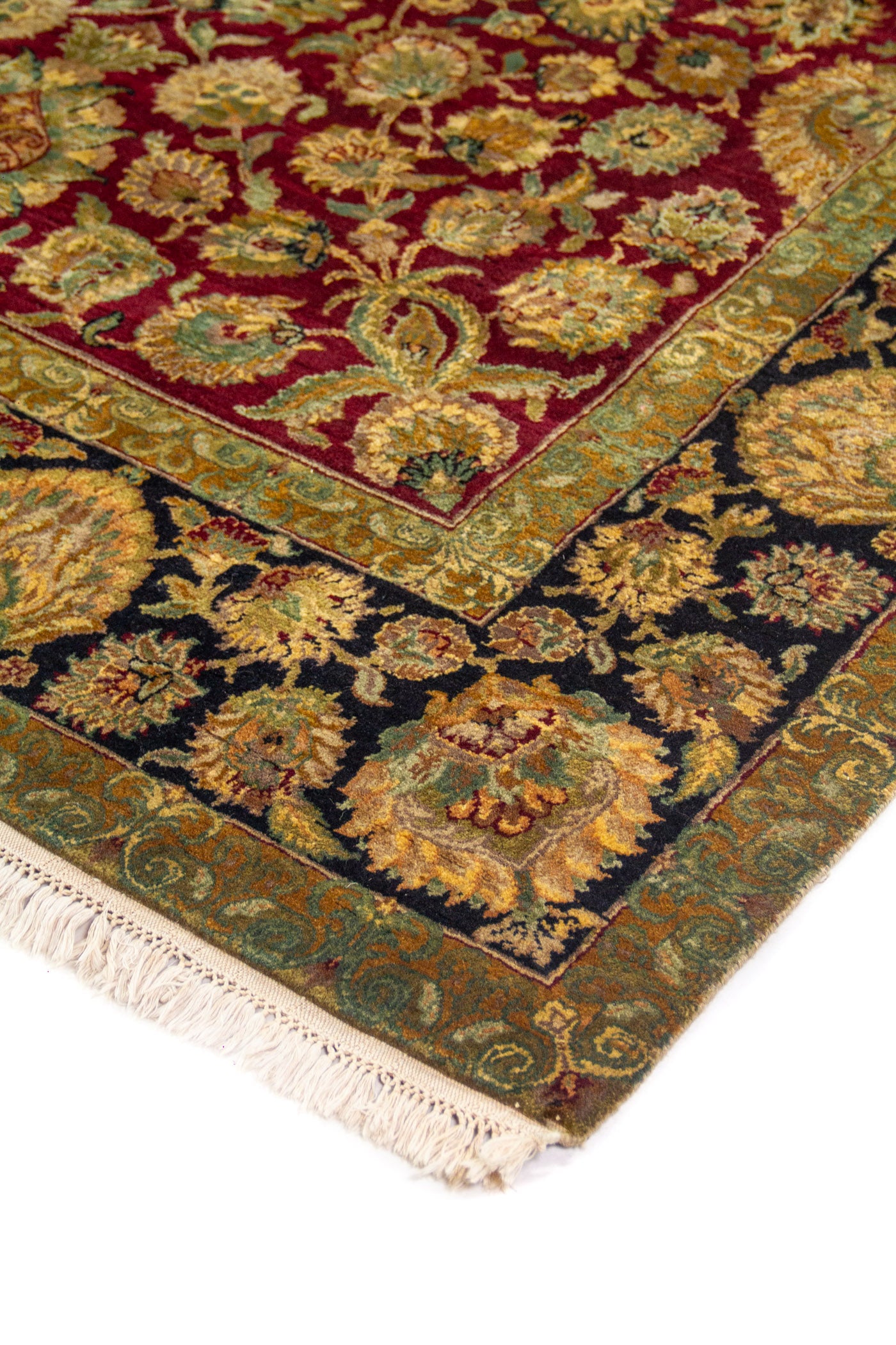 Diseño: Esta alfombra destaca por su elegante fondo rojo, que aporta calidez, profundidad y un aire sofisticado al espacio. Su diseño floral está compuesto por abundantes motivos vegetales y flores ornamentales distribuidas con gran armonía, creando un efecto visual rico y refinado. La guarda negra genera un contraste intenso que realza cada detalle del dibujo, mientras que el marco en verde oliva suaviza la composición y le añade un matiz clásico y distinguido. El conjunto transmite una sensación de lujo, tradición y artesanía, ideal para enriquecer ambientes con una estética atemporal y decorativa inspirada en el arte textil oriental.