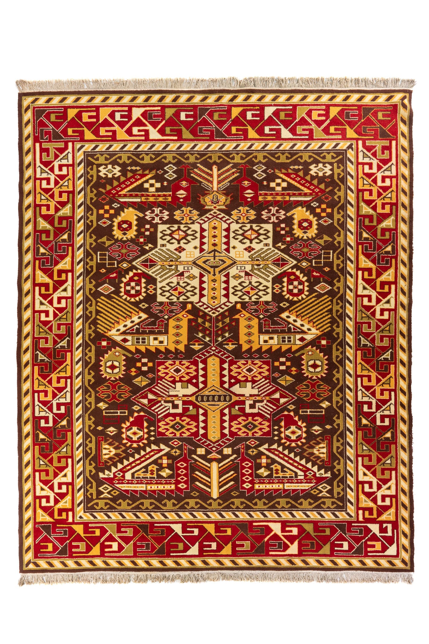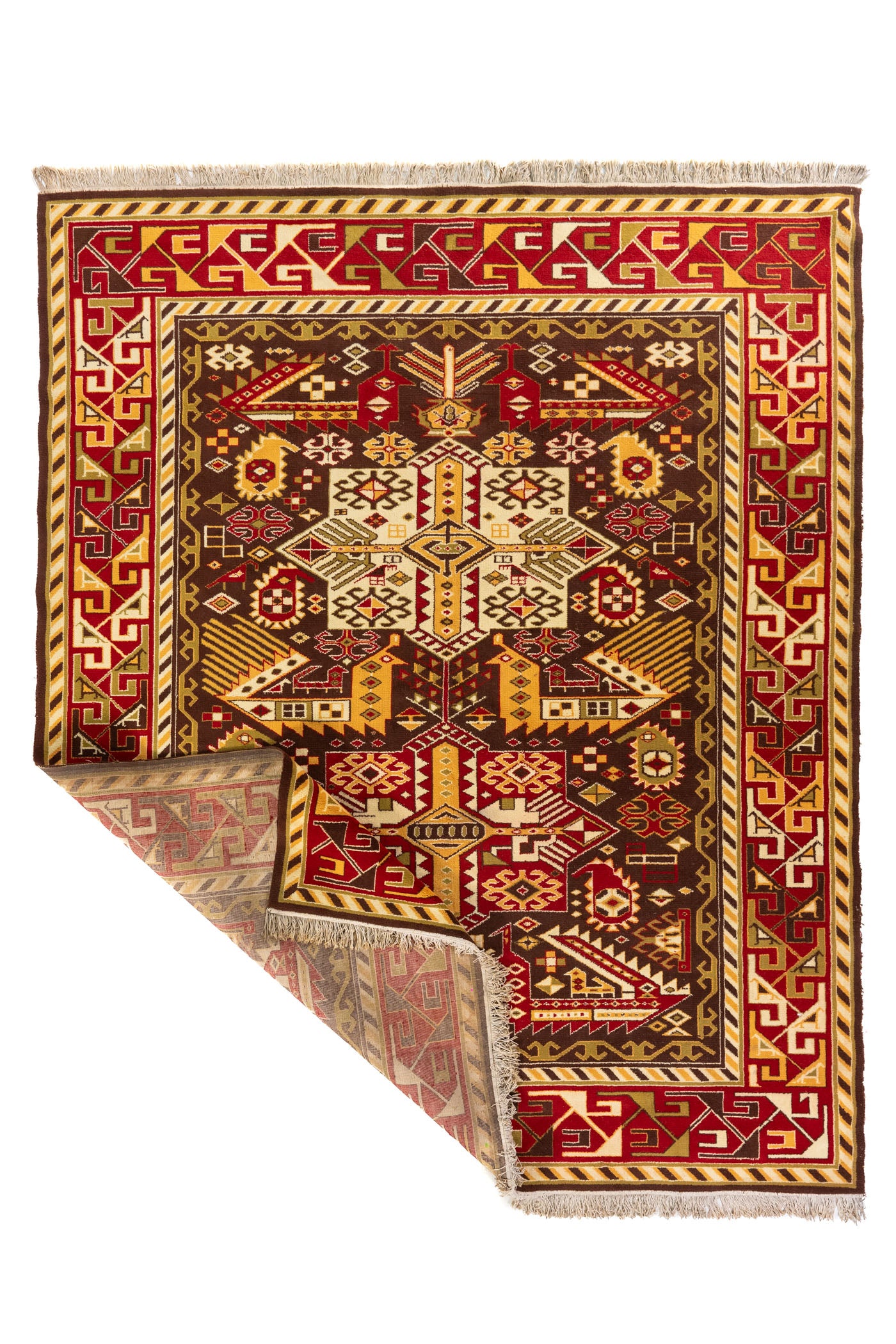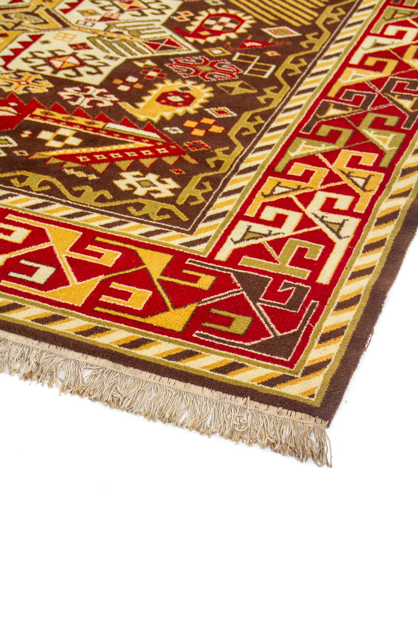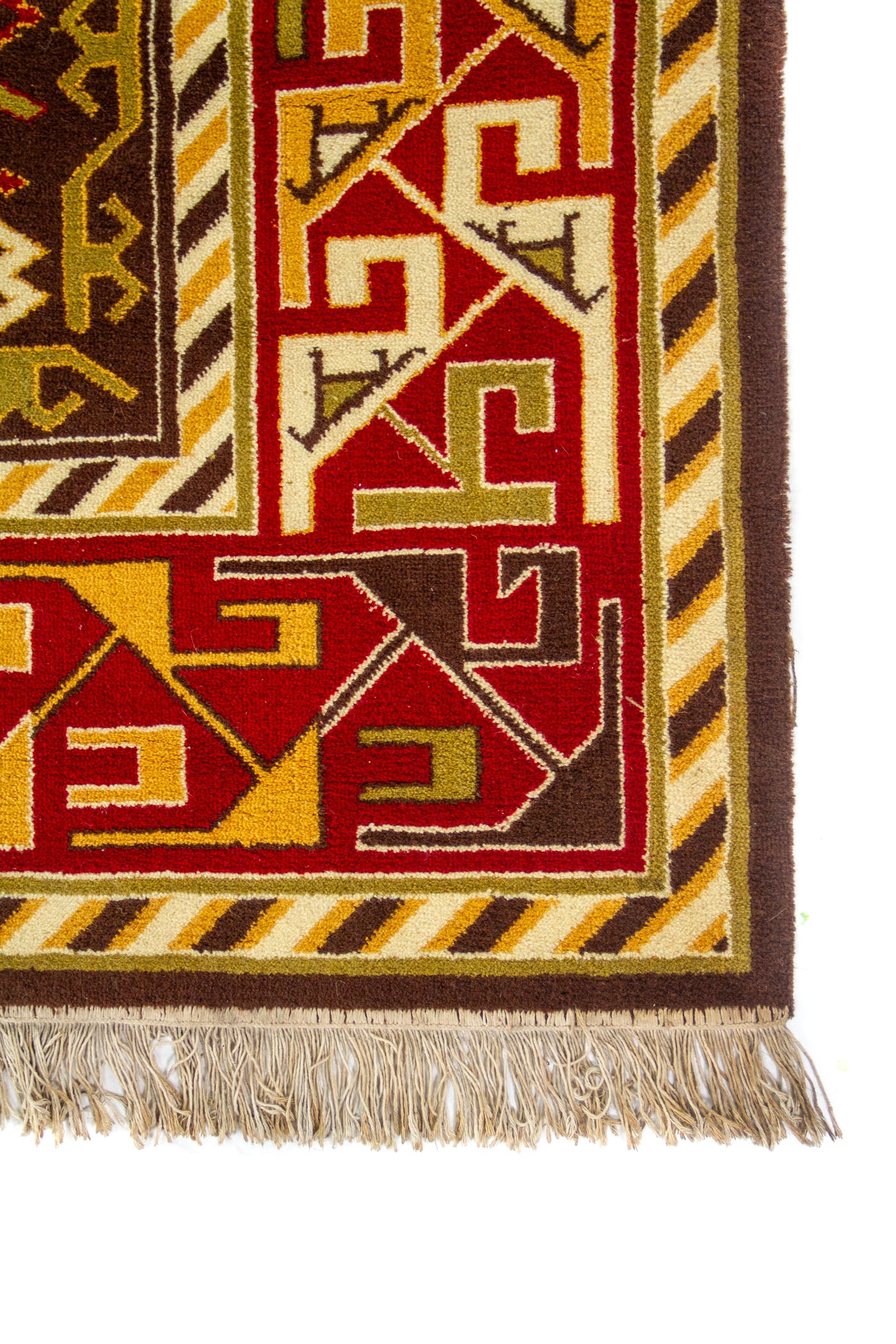 Diseño: Esta alfombra de estética tribal y geométrica combina un campo central en marrón profundo con figuras simétricas tipo tótem y detalles en beige, amarillo y rojo que aportan carácter y equilibrio visual.