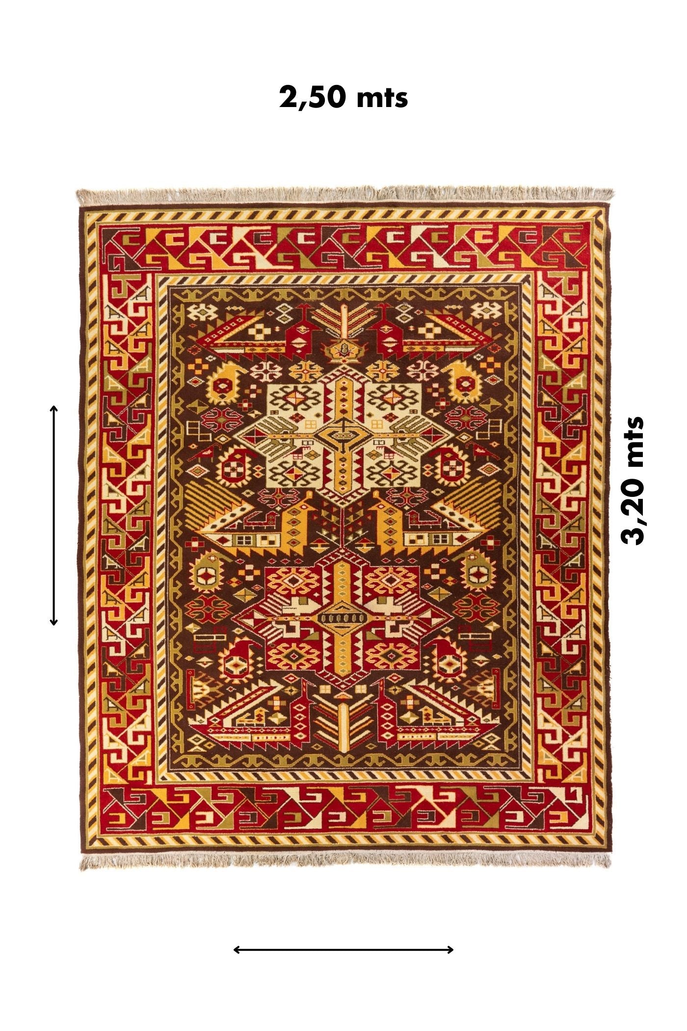 La guarda roja, con bandas diagonales en tonos cálidos, enmarca la composición con fuerza y le da un acabado muy decorativo. Los pequeños símbolos repartidos por el interior crean un efecto artesanal rico en matices, mientras que los flecos rematan la pieza con un toque tradicional. Es una opción ideal para aportar calidez, personalidad y un aire étnico sofisticado a salas, comedores o estudios, especialmente en espacios que buscan contraste y textura.