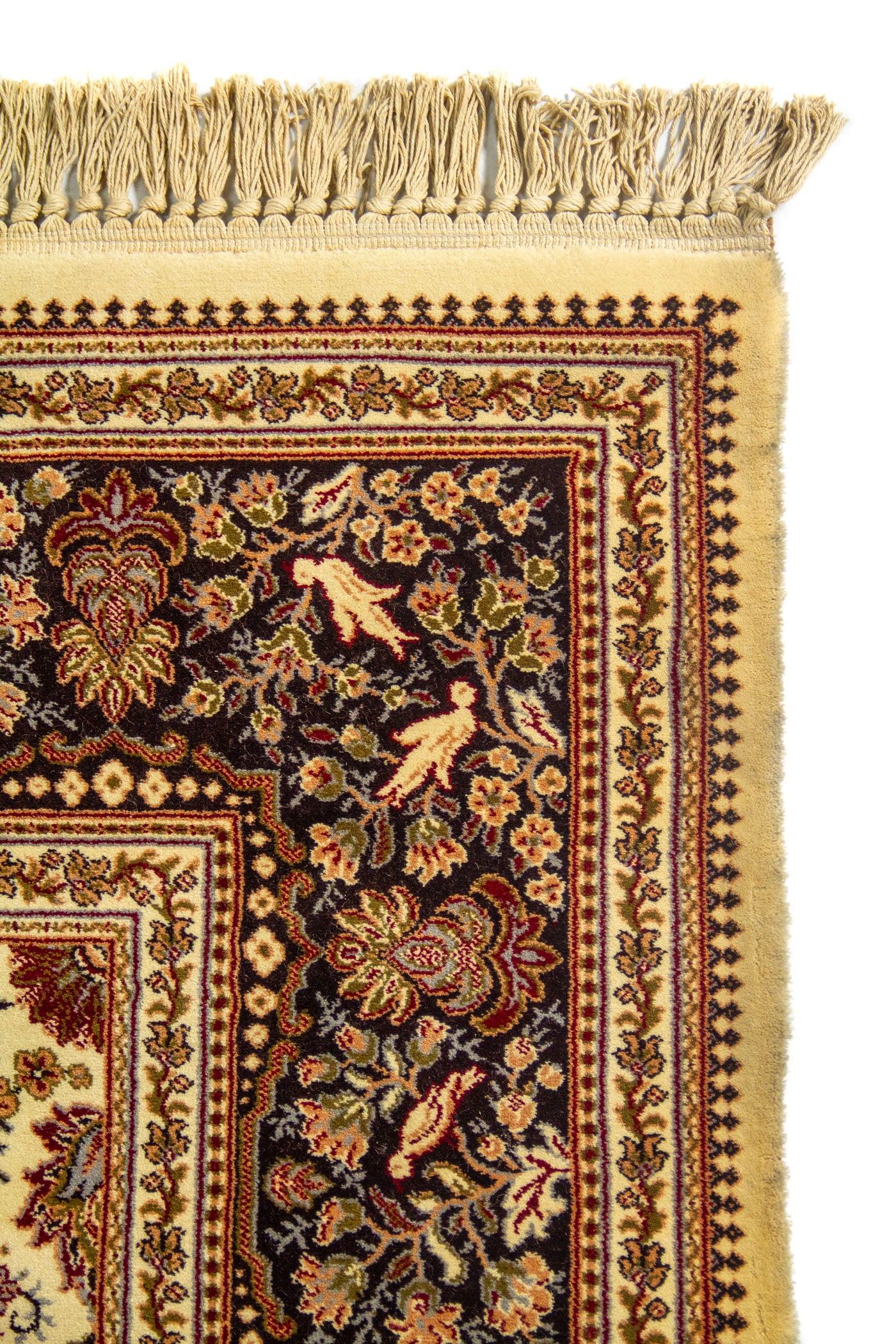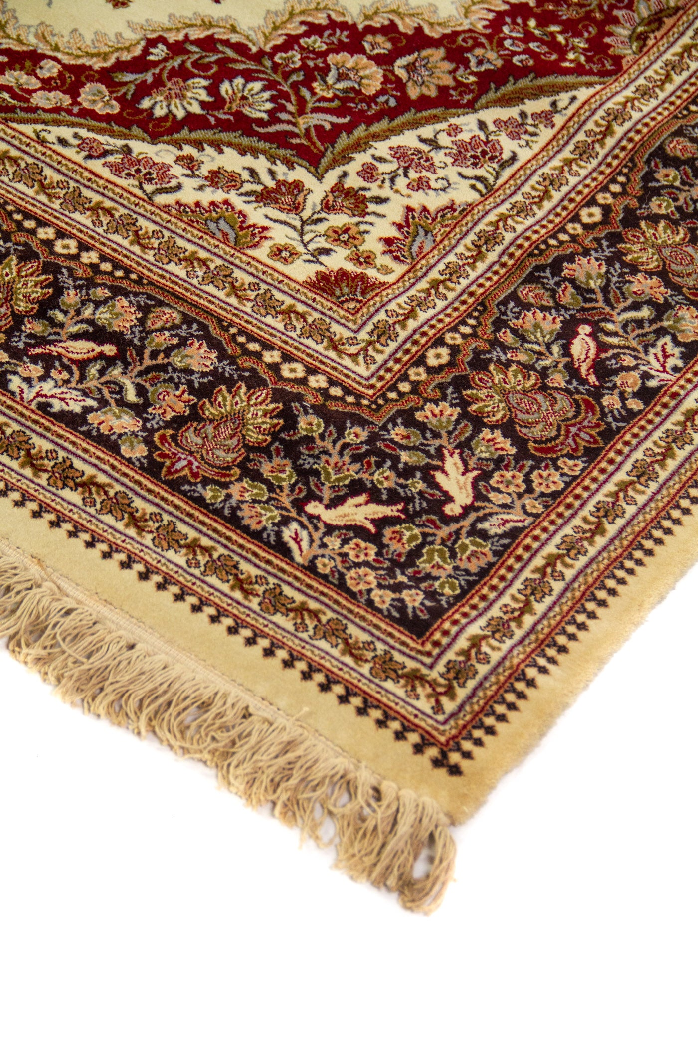 Diseño: Esta alfombra destaca por su composición clásica y elegante, donde el fondo beige aporta luz y equilibrio, mientras el medallón central en rojo genera profundidad y carácter. La guarda oscura, ricamente decorada con motivos florales y arabescos, enmarca la pieza con sofisticación y crea un contraste muy refinado con el centro más claro. Los detalles ornamentales distribuidos de forma simétrica realzan su estética tradicional y le dan un aire atemporal, ideal para vestir cualquier espacio con calidez, distinción y un marcado estilo oriental. Los flecos en sus extremos completan la pieza con un acabado artesanal que resalta aún más su belleza decorativa.