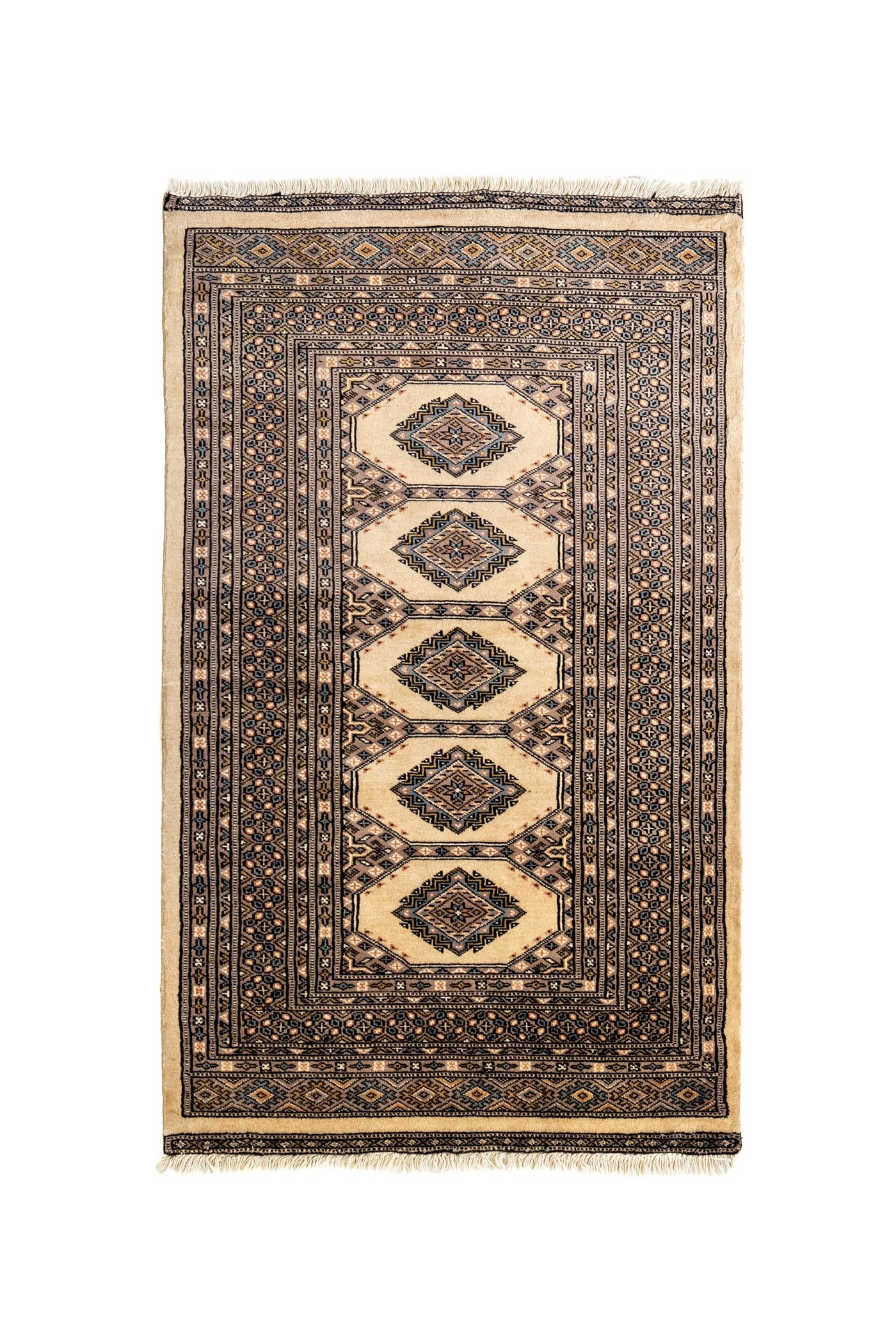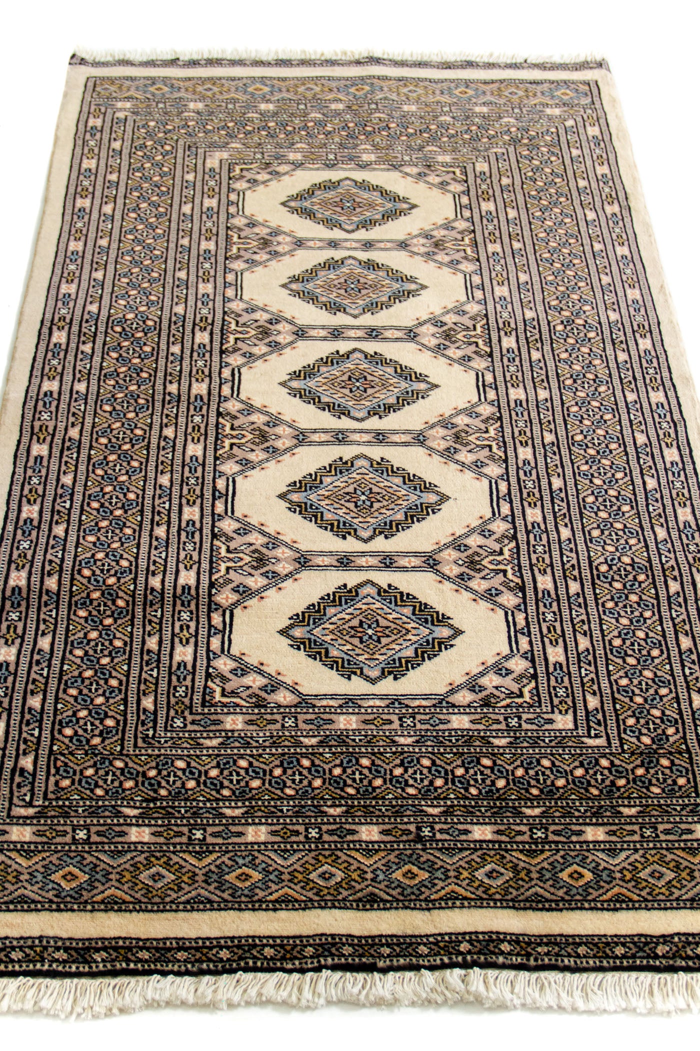 Diseño: Esta alfombra oriental destaca por su sofisticado fondo crema, adornado con un patrón central repetido de medallones geométricos en tonos azul, marrón y negro. Los bordes están cuidadosamente decorados con franjas intrincadas que combinan pequeños motivos florales y rombos simétricos, creando un marco visualmente armonioso. La precisión del diseño refleja una ejecución artesanal meticulosa y un profundo respeto por la tradición textil de Asia Central.